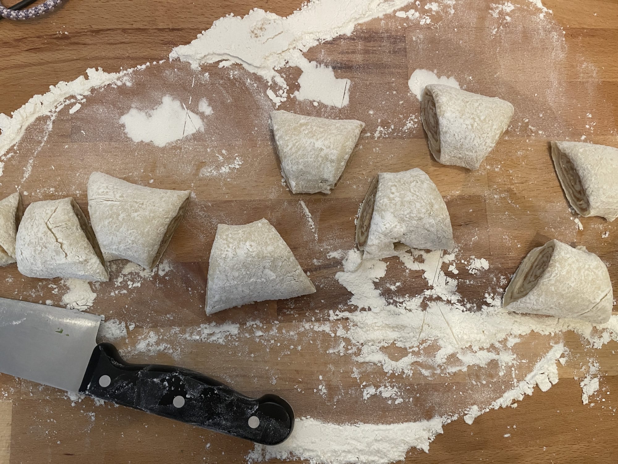 - Den Teig aufrollen so das eine lange "Wurst" entsteht und dann die Wurst in viele kleine Trapeze schneiden, also immer abwächselnd ein bisschen schräg nach Links schneiden, und dann ein bisschen schräg nach Rechts, wie auf dem Bild abgebildet ist.