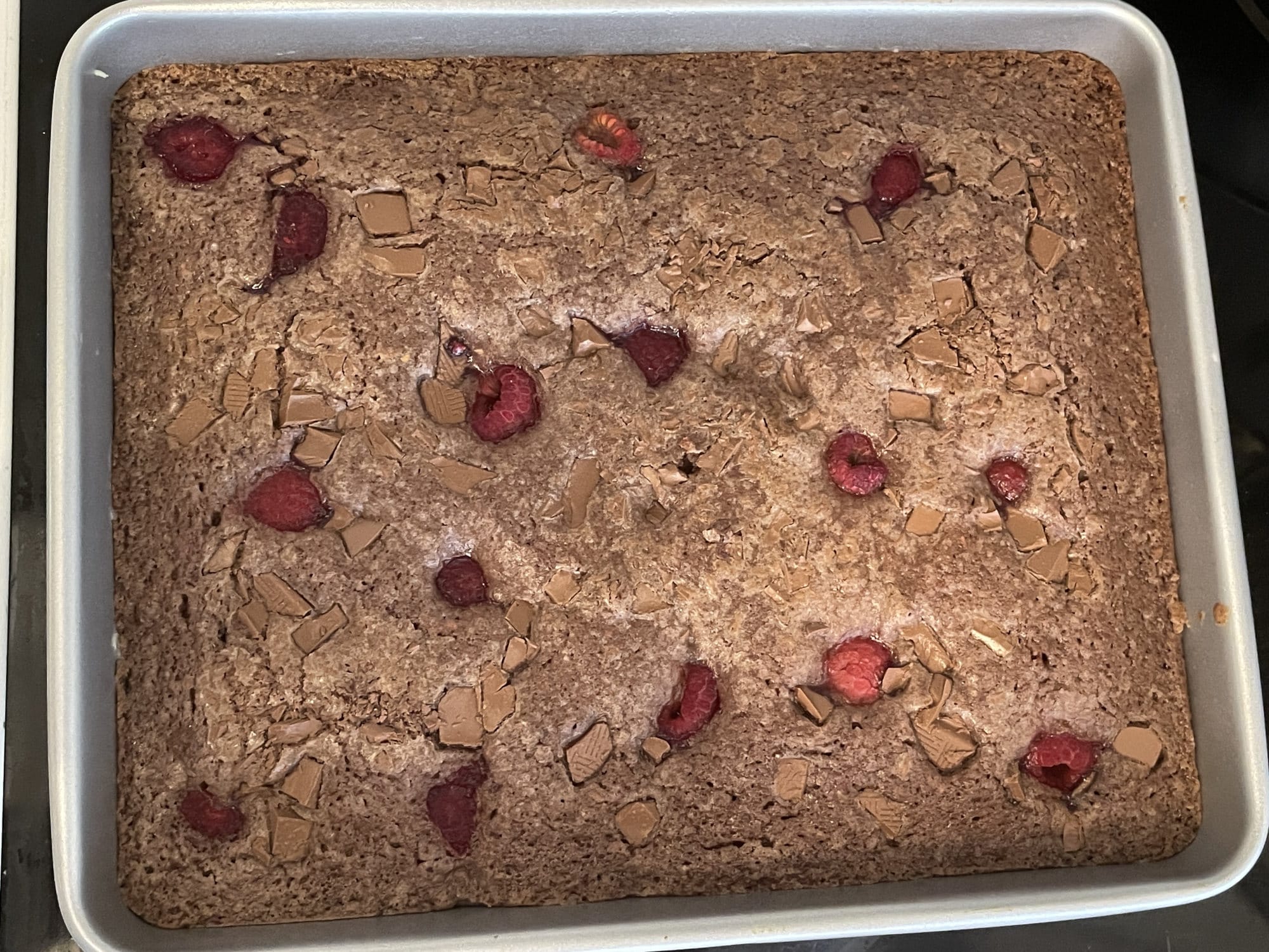 - Ein tiefes Backblech mit Butter einschmieren und dann die Brownie-Masse hineinfüllen. Dann mit der restlichen Kouvertüre und den Himbeeren verzieren und bei 150 Grad Ober- und Unterhitze 30-40 min lang backen.