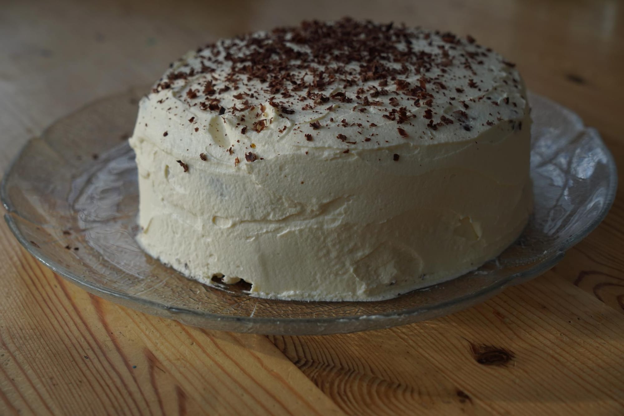 - Die Sahne auf dem ganzen Kuchen verteilen bis er vollständig bedeckt ist. Evtl. noch ein bisschen Zartbitter Schokolade raspeln und über den Kuchen streuen. Nochmals kurz in den Kühlschrank stellen.